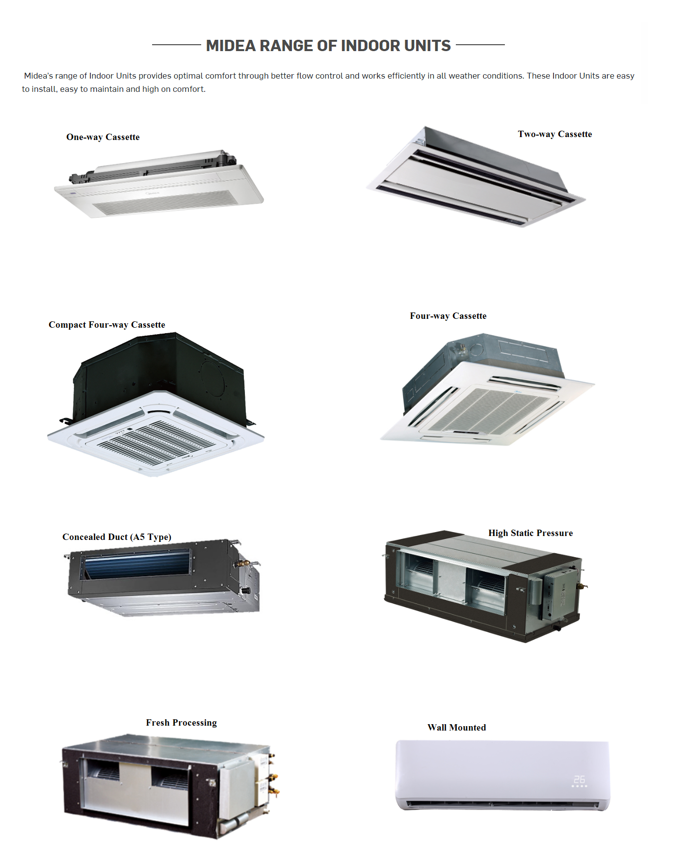 These units are ideal for open-plan spaces, large rooms, offices, and commercial areas, where a consistent and wide distribution of conditioned air is required.