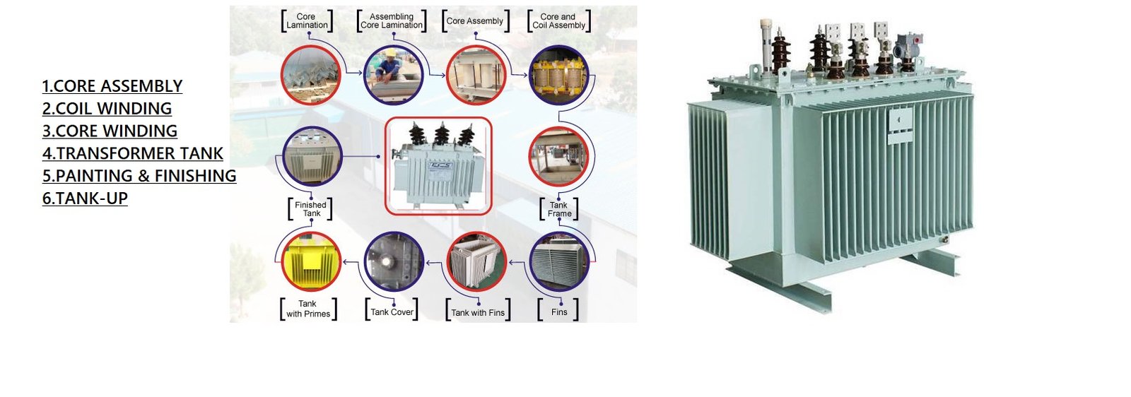 The core-coil assembly and tank supplied by the fabrication department are then taken into the tank-up stage.